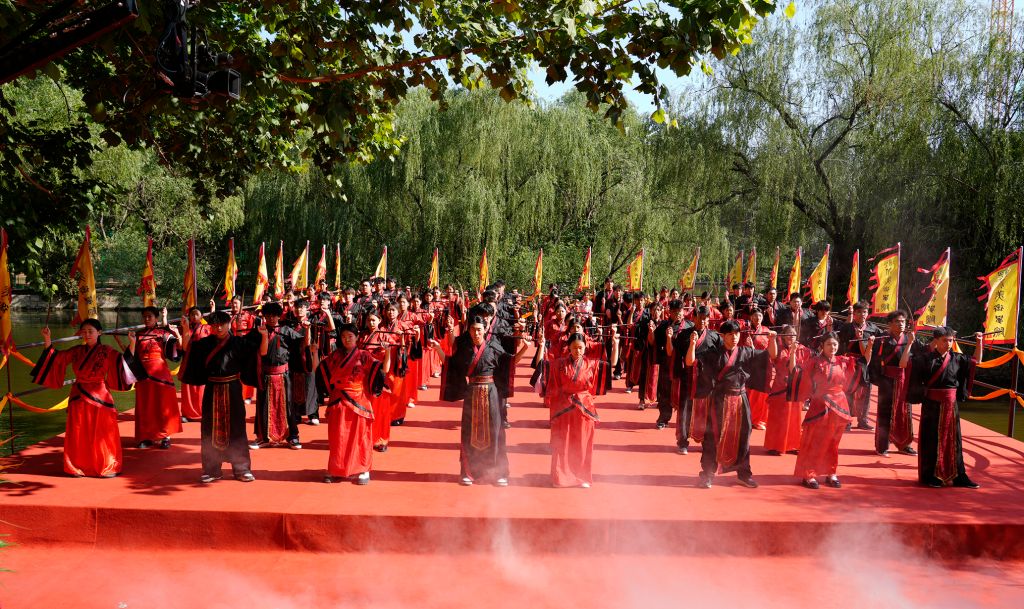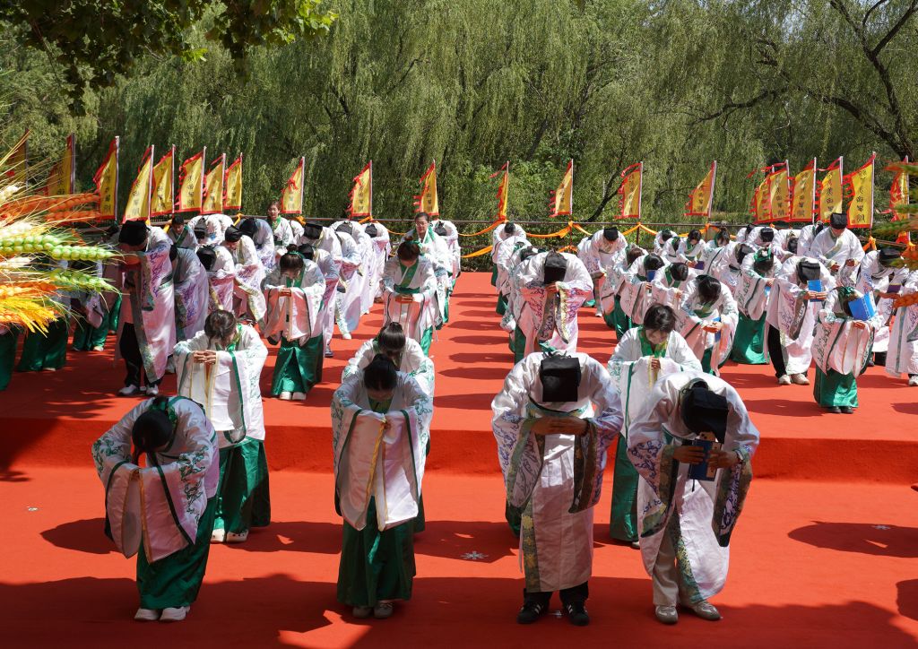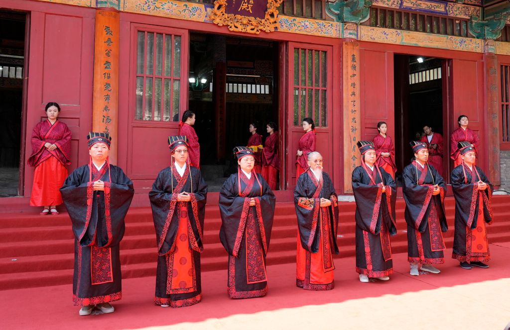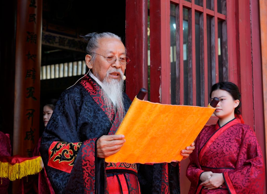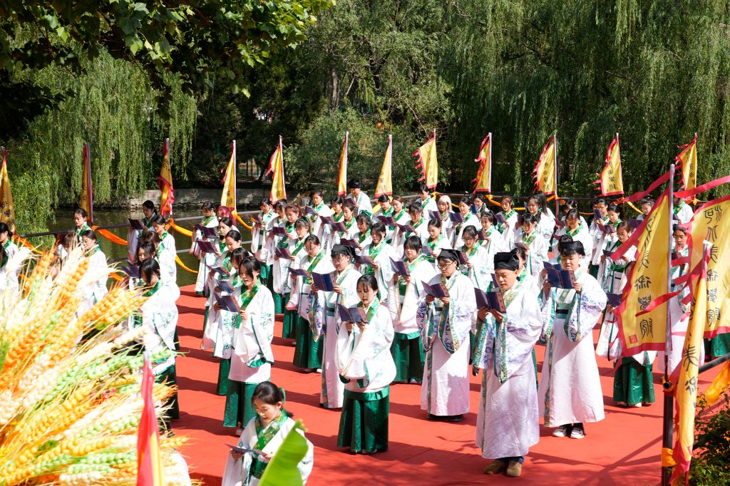 汉帜飞扬,鼓乐齐奏。上午8时30分,钟鸣和“启户”声响起,朱门大开,六十四舞者执羽而入,八佾舞翩跹舒展。众师生身着汉服,缓步行至殿前,庄重而立。