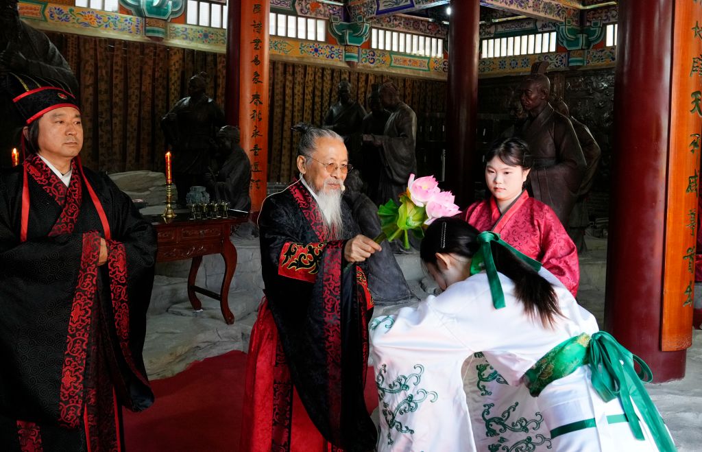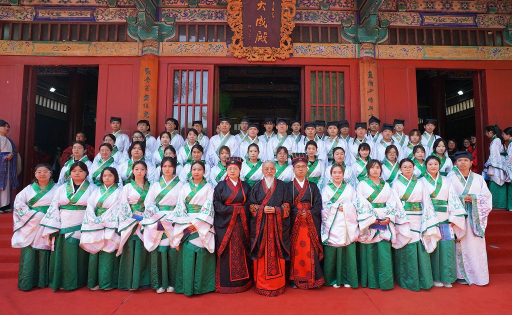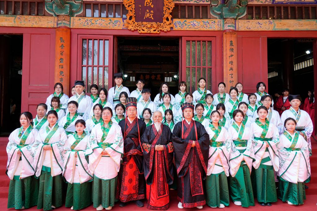 众学子高声齐诵《孔子赞》,声浪激荡回廊。然后行三拜之礼:一拜父母恩,春晖寸草育栋梁;二拜师者谊,杏坛授业传薪火;三拜母校情,春风化雨润芳华。礼成后,学子依次入殿完成仪式。