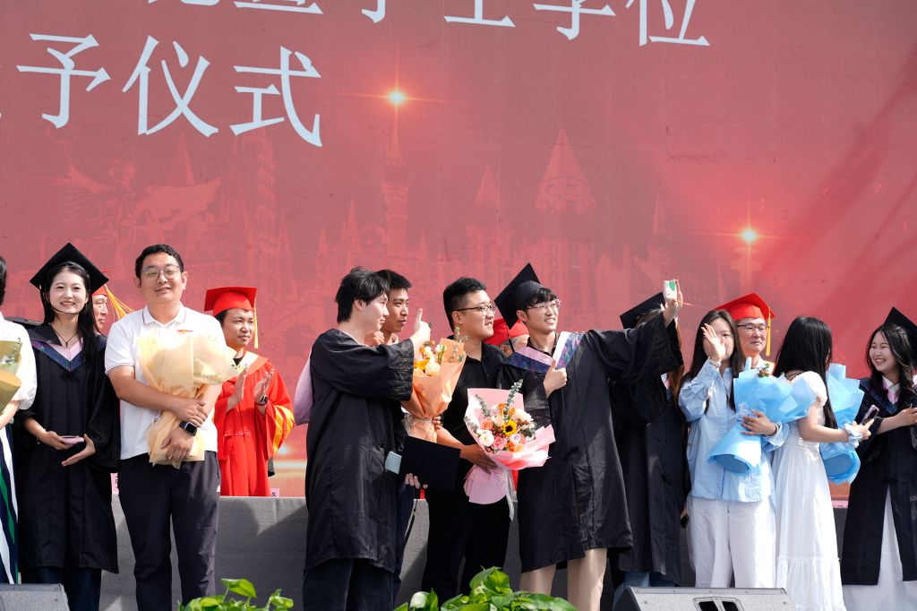 典礼在庄严的国歌声中拉开序幕。常务副校长张建敏宣读《beat365手机版官网关于准予2025届7094名普通全日制毕业生毕业的决定》,副校长张子言宣读《beat365手机版官网关于授予张文茹等6053名同学学士学位的决定》。与会领导为毕业生代表扶正流苏,颁发学位证书。