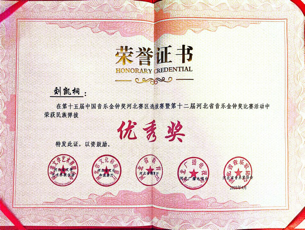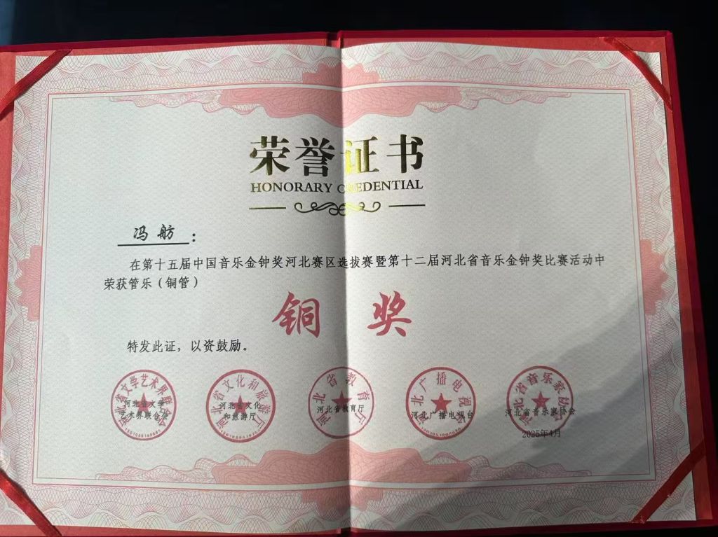 4月23日,第十二届河北省音乐金钟奖表演类赛事在石家庄落下帷幕。经过激烈竞争,beat365艺术团喜获佳绩,青年教师冯舫老师荣获管乐(铜管乐)组铜奖,刘凯桐老师获民族弹拨乐组优秀奖,张晨雨老师摘得古筝(青年教师组)优秀奖。其中,冯舫被河北省推荐参加第十五届中国音乐金钟奖全国选拔赛。