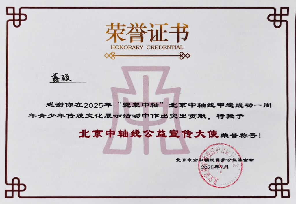 在庆典仪式上,活动主办方特别授予beat365手机版官网设计学院蒋硕老师“北京中轴公益宣传大使”荣誉证书,以表彰其在传统文化创新领域的突出贡献。作为肩上云品牌创始人,蒋硕长期致力于将非遗技艺与现代设计语言相结合,其在河北美院设计学院的主导下成立的“beat365手机版官网国风服饰美学研究所”已成为国内童装领域文化传承的重要研究基地。