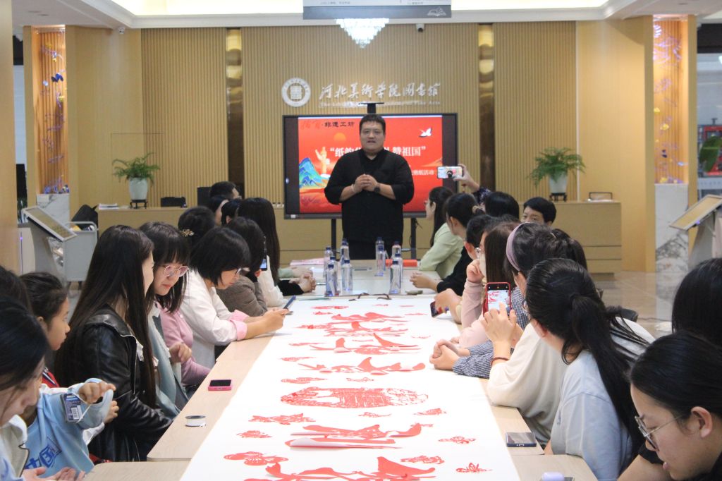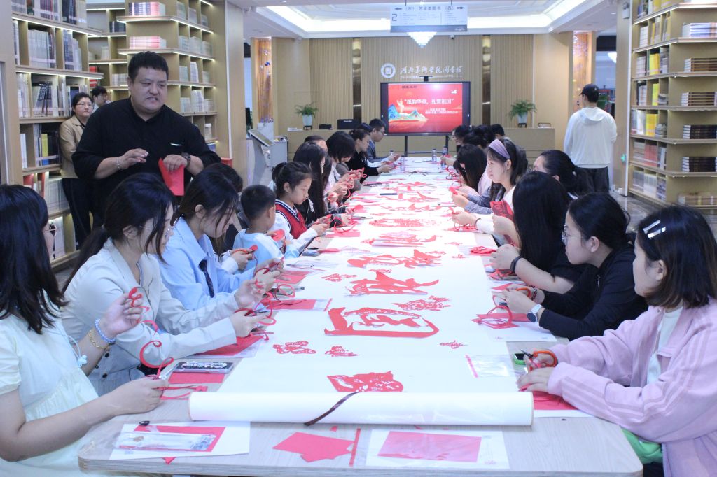 “纸韵华章,礼赞祖国”的7.6米长卷剪纸作品在图书馆指间·非遗工坊专区进行展示,吸引了众多进馆师生驻足欣赏。作品不仅体现了剪纸艺术的独特魅力,更凝聚了河美师生对祖国的无限热爱。