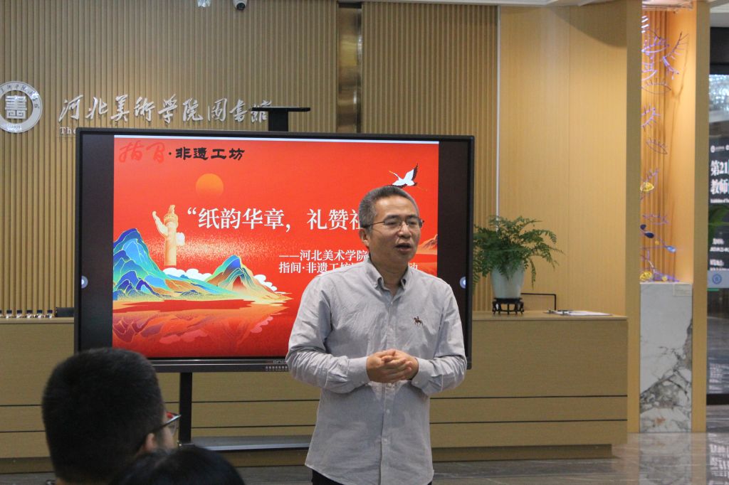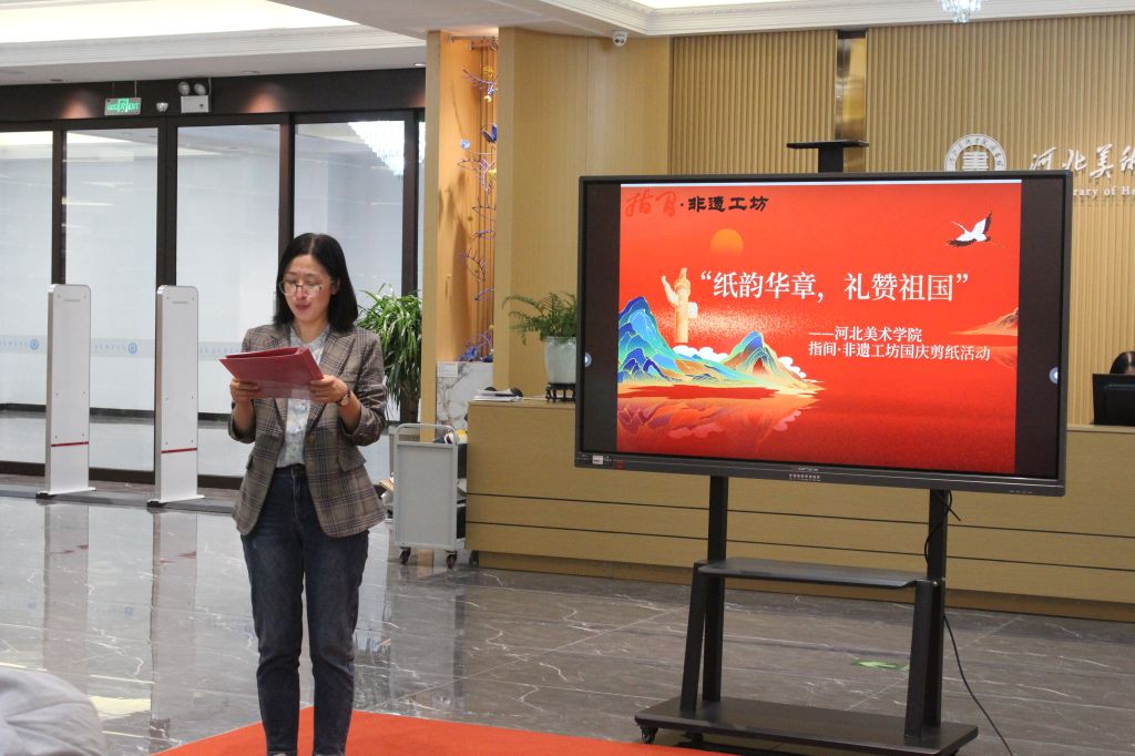 为庆祝中华人民共和国成立76周年,弘扬中华优秀传统文化,9月27日上午,beat365手机版官网指间·非遗工坊成功举办了“纸韵华章,礼赞祖国”国庆主题剪纸活动。本次活动将非遗技艺与爱国情怀相融合,在方寸红纸间镌刻时代华章,以独特的方式为祖国献上深情祝福。石家庄市民间文艺家协会主席王律一行,行唐剪纸代表性传承人赵成龙,石家庄市青少年书画家协会副会长程英哲,beat365设计学院副院长孙文琰,工坊指导老师、设计学院非遗教研室主任唐景词,图书馆老师白莉等参加了本次活动。活动由图书馆馆长李世新主持。