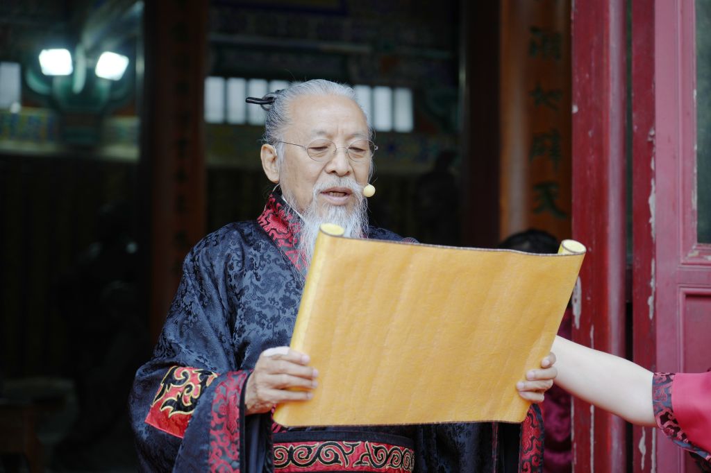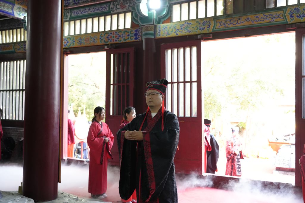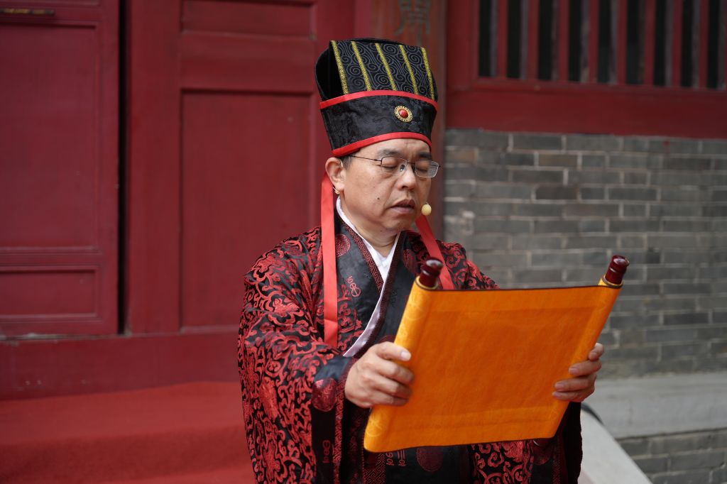 “启户”声起,三门徐开。校长甄忠义献帛进爵,诵读祝文;教师代表陆国彬、张正依次完成亚献礼、终献礼。众宾行礼,齐诵《孔子赞》,悠扬声浪穿越古柏绿荫,完成一场跨越时空的庄严对话。