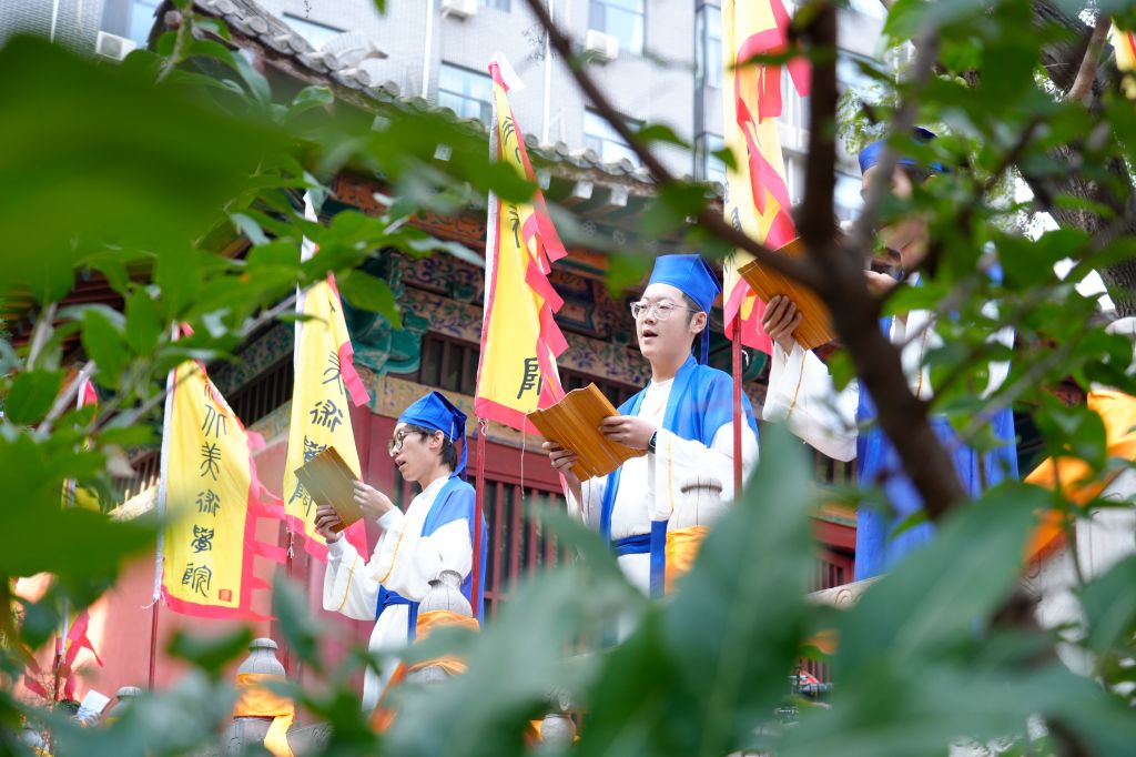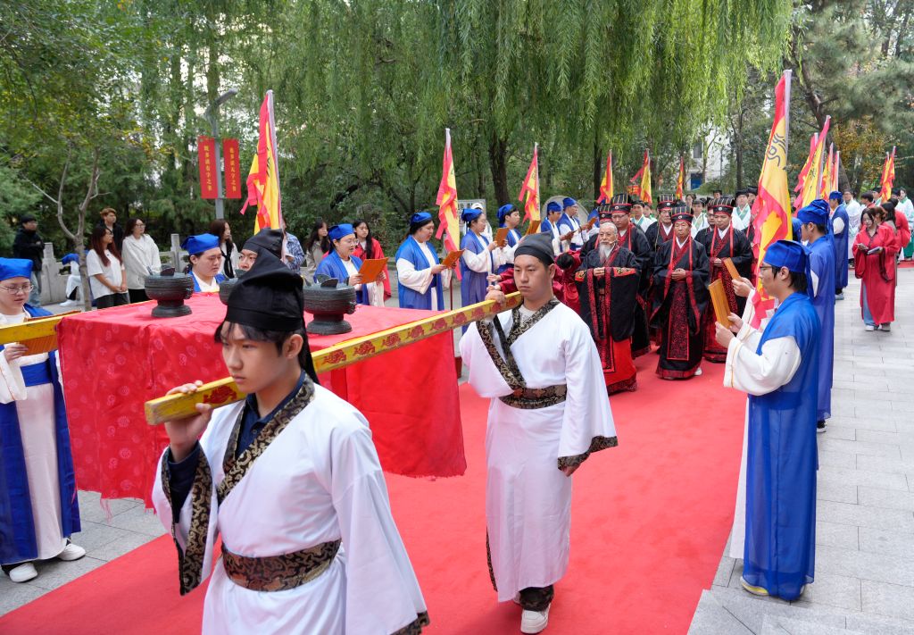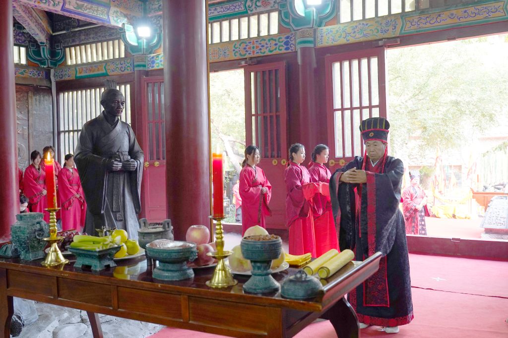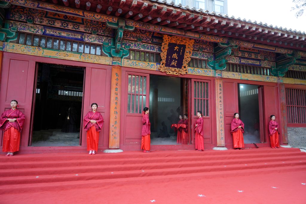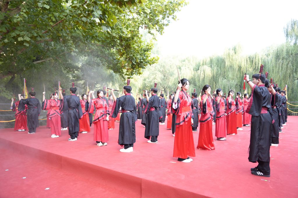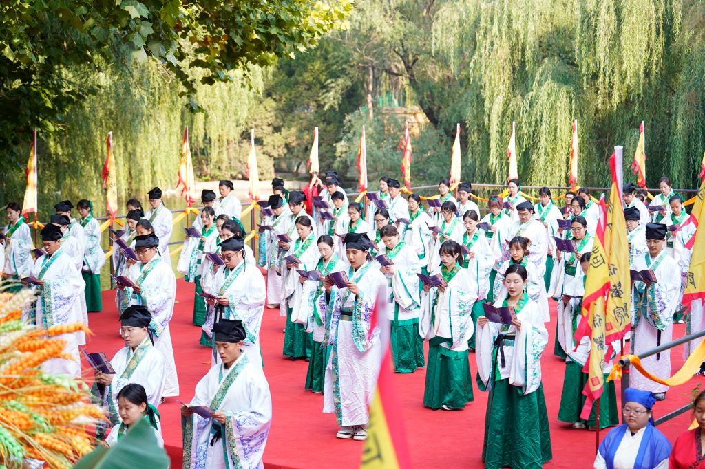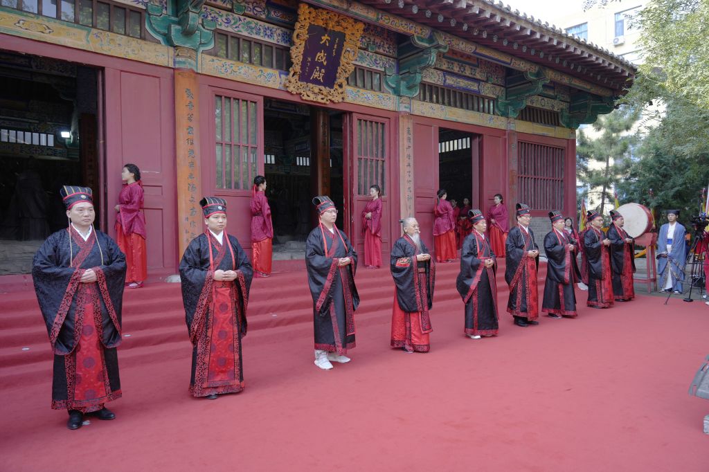 上午8时,鼓声鸣响,众学子执羽籥而舞八佾,齐声诵唱《论语》,肃穆的舞步与朗朗书声汇成对先贤的千年致意。