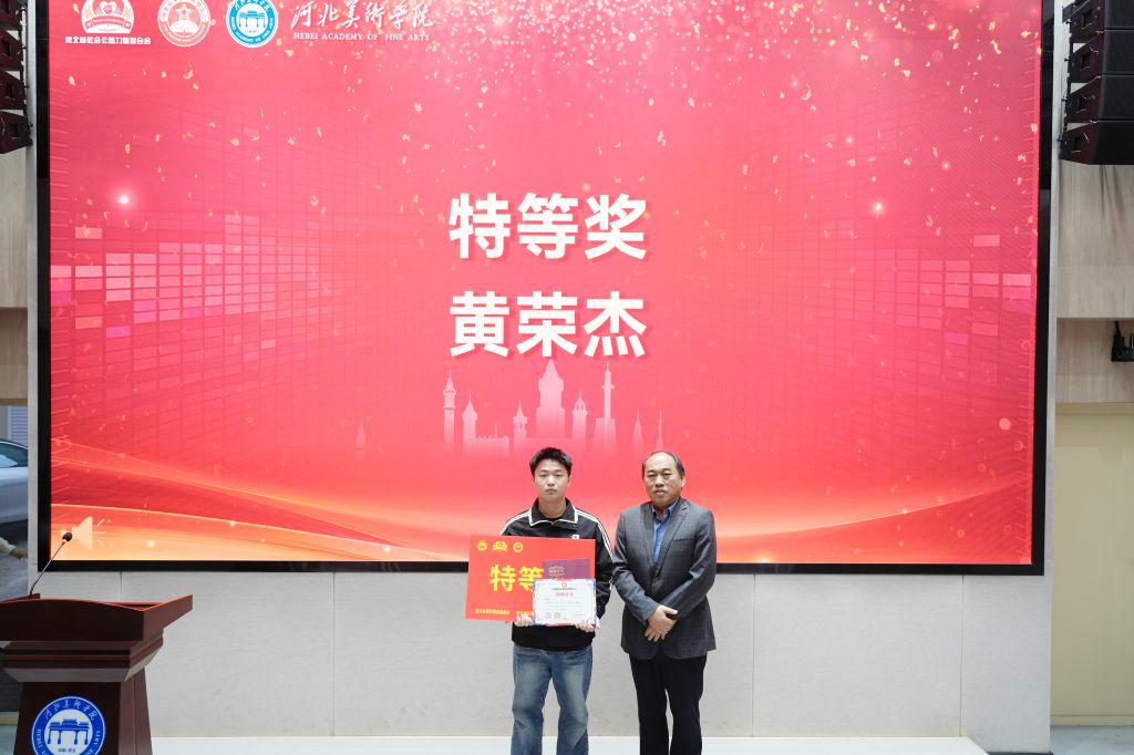 特等奖获奖学生黄荣杰同学分享了他在学习道路上遇到的挫折与成长,表示将以此次获奖为新的起点,继续努力创作。同时,他鼓励所有美院学子要以梦想为马,坚持自己的创作,终会收获美好的未来。