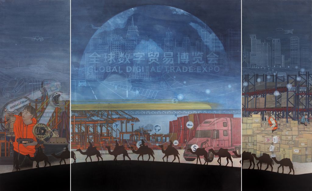 《新时代全球数字贸易化》-韩典亮- 200cm×360cm -云肌麻纸、矿物色、金属箔、- 2024年