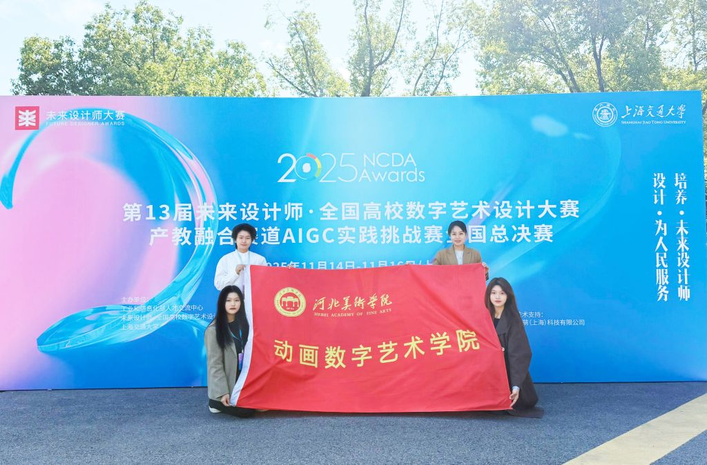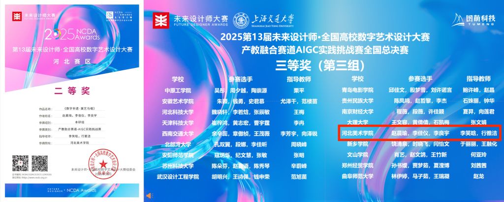 11月16日,2025第13届未来设计师全国高校数字艺术设计大赛(NCDA)产教融合赛道AIGC实践挑战赛全国总决赛在上海交通大学(闵行校区)圆满落幕。beat365手机版官网动画数字艺术学院学生团队(赵晨瑜、李佳仪、李良宇)在指导教师李笑晗、行雅洁的带领下,凭借作品《数字非遗·冀艺马魂》在此大赛中披荆斩棘,荣获河北赛区二等奖、全国总决赛三等奖,展现了河美学子在AIGC技术与数字技术融合领域的探索。