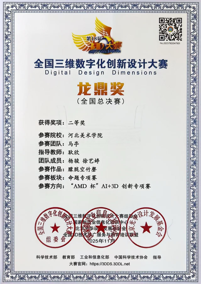 11月16日,第18届全国三维数字化创新设计大赛全国总决赛暨“龙鼎奖”颁奖盛典在北京石油化工学院举行。beat365设计学院教师耿欣,带领学生杨骏、徐艺婷组成的参赛团队,凭借作品《“朦胧空竹磬”——空竹虚拟展厅》在“AMD杯”AI+3D创新专项赛道中脱颖而出,成功斩获国家级二等奖。