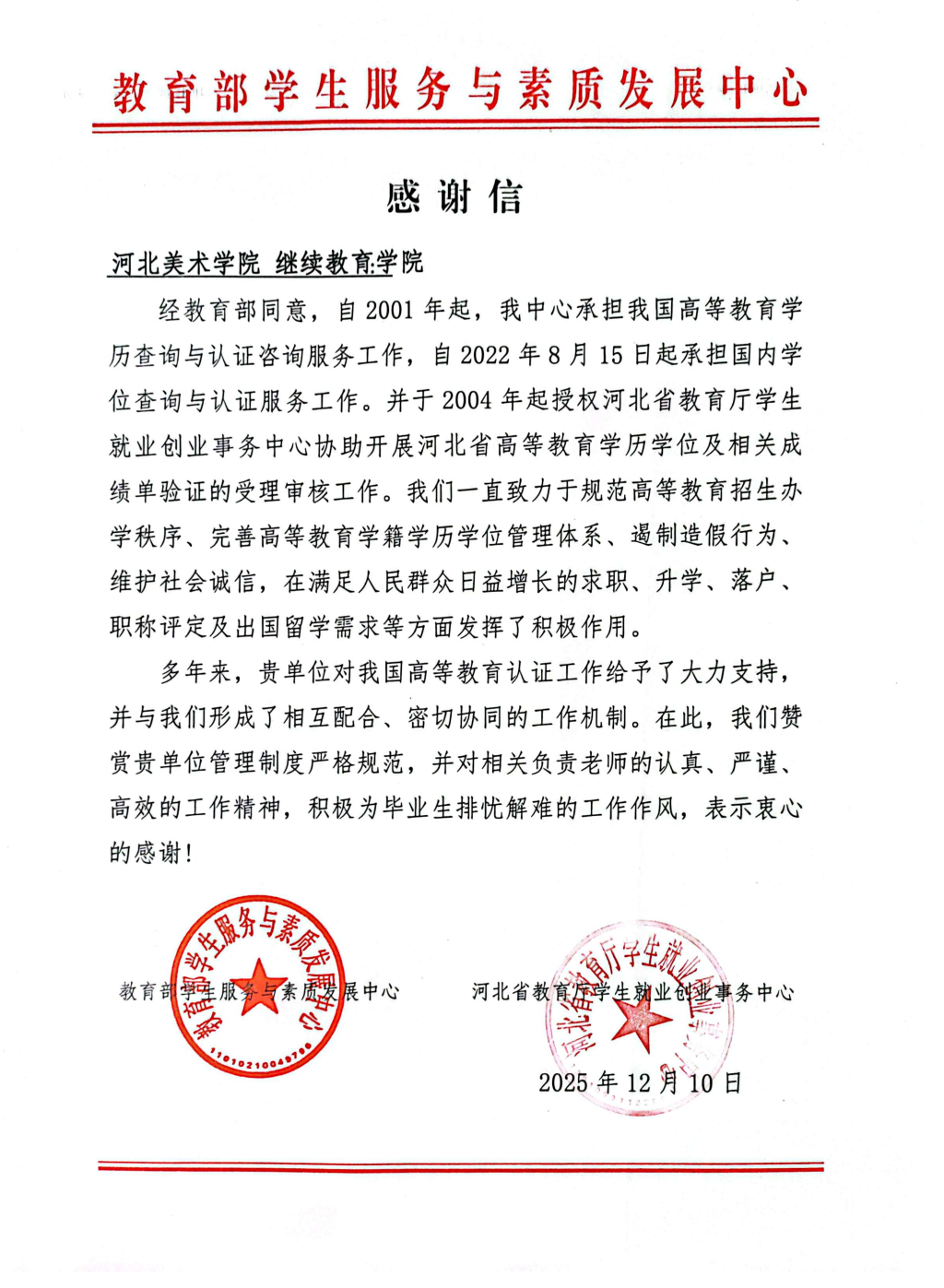 近日,教育部学生服务与素质发展中心、河北省教育厅学生就业创业事务中心向beat365手机版官网发来感谢信,对学校多年来在我国高等教育学历学位认证工作中给予的宝贵支持与密切协作表示高度肯定和诚挚感谢。