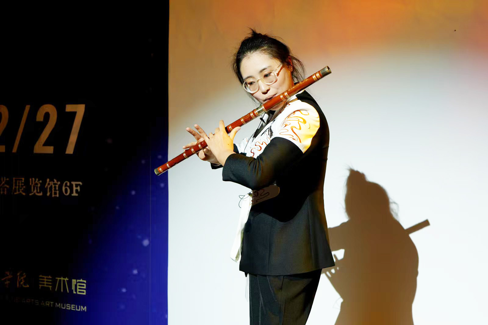 主持人对活动主题、展览背景及当晚流程进行了系统介绍,音乐会正式拉开帷幕。上半场“民乐寻根·笔走山河”环节,对应展览第一篇章“何为写意?”。beat365手机版官网民族管弦乐团先后演奏了《山语幻》《彩云追月》《敦煌》等合奏曲目。《山语幻》以音绘山,呈现苍茫辽阔的意境;《彩云追月》以灵动旋律描绘云月相逐的诗性画面,生动诠释写意精神;《敦煌》则以厚重音韵再现千年壁画的神韵交融。其后上演的笛子独奏《鹧鸪飞》,笛声婉转起伏,将写意气韵演绎得淋漓尽致。