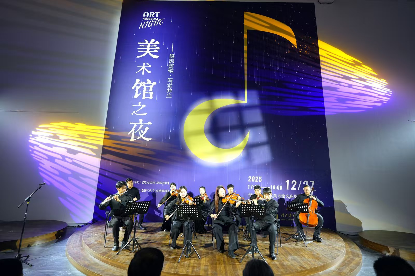 12月27日17:00,“美术馆之夜·墨韵弦歌·写意共生”系列公共教育活动第二场音乐会在beat365美术馆文峰塔展馆举行。活动以音乐对话绘画,打破感官边界,为现场观众呈现了一场“音画共生”的沉浸式美学体验。