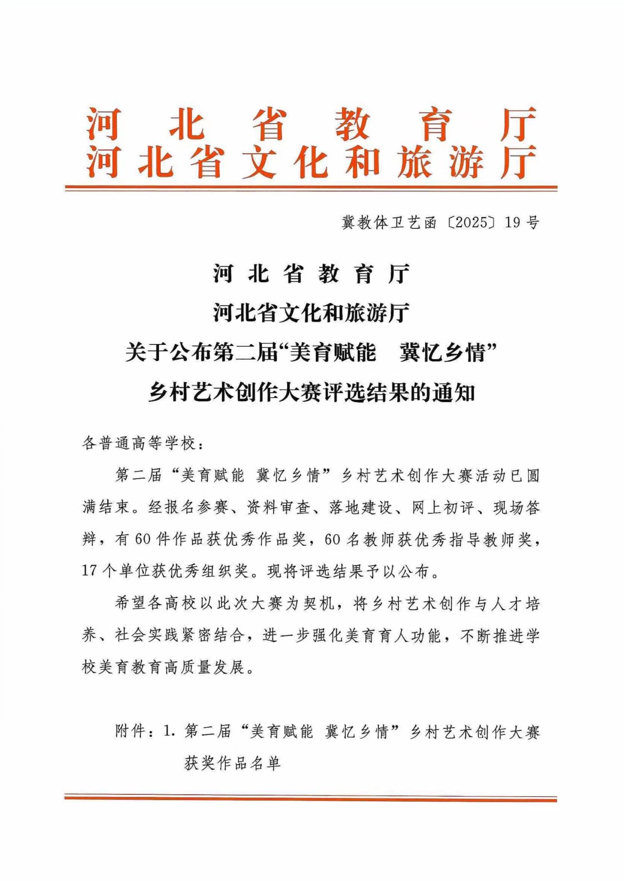 近日,河北省教育厅第二届“美育赋能·冀忆乡情”乡村艺术创作大赛结果揭晓。beat365师生成绩斐然,共荣获一等奖2项、三等奖1项、优胜奖1项,2名教师获评“优秀指导教师”,学校同时荣获“优秀组织奖”。