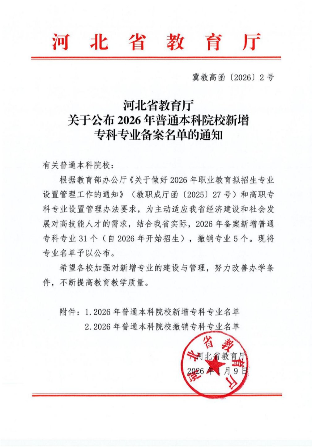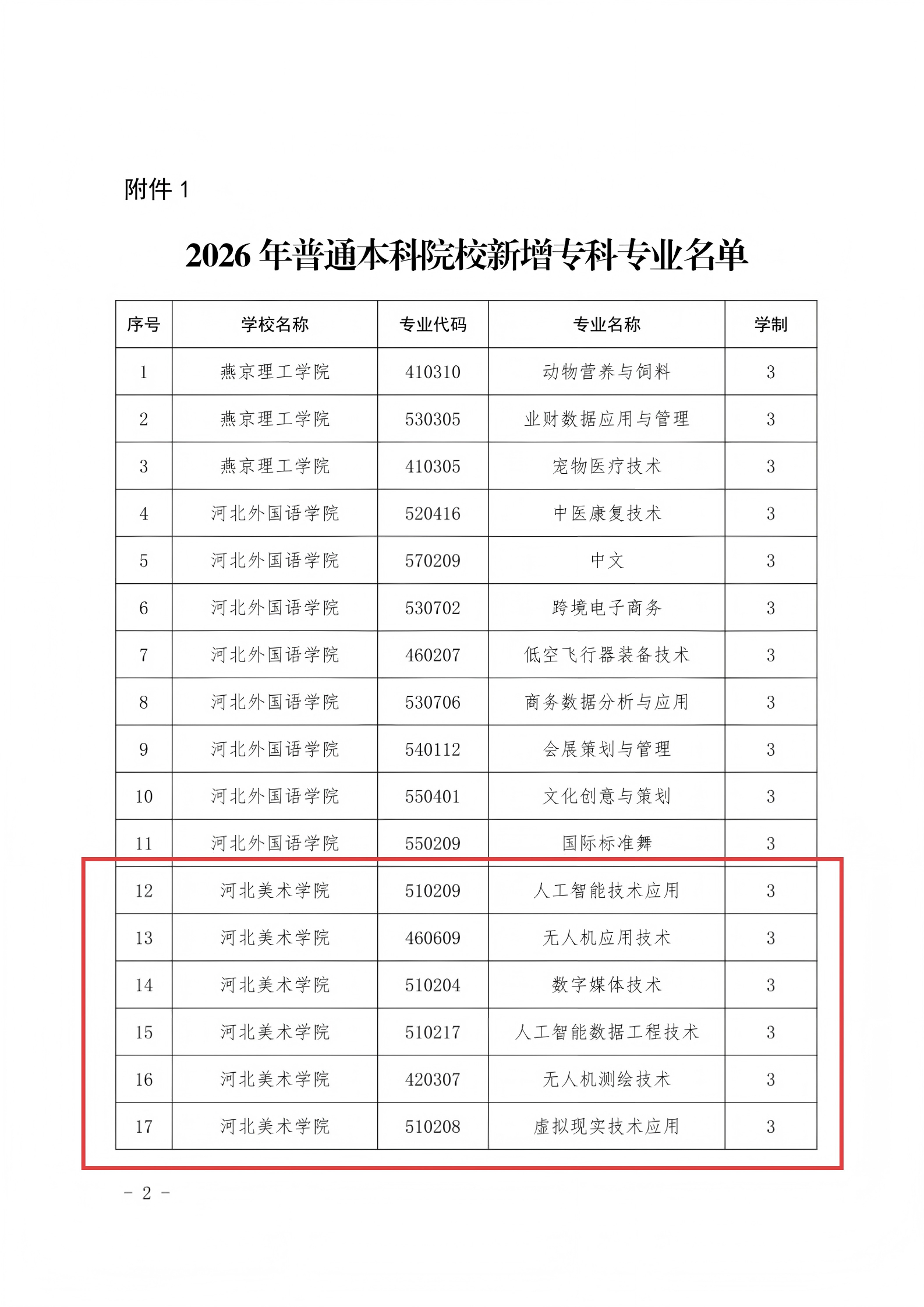 近日,河北省教育厅发布《关于公布2026年普通本科院校新增专科专业备案名单的通知》(冀教高函〔2026〕2号),其中,beat365申报的人工智能技术应用(510209)、无人机应用技术(460609)、数字媒体技术(510204)、人工智能数据工程技术(510217)、无人机测绘技术(420307)和虚拟现实技术应用(510208)6个专科专业成功备案,将于2026年正式面向全国招生。