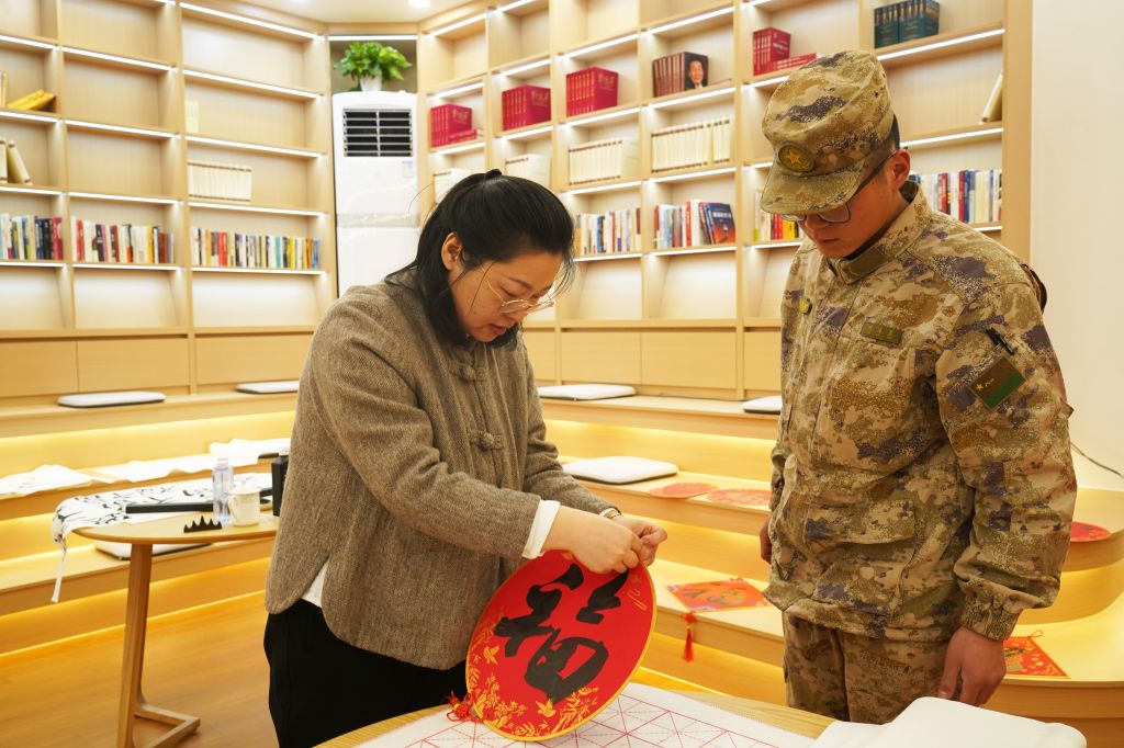 现场书写环节,大红宣纸整齐铺展,老师们挥毫泼墨、笔走龙蛇,以行云流水的行草书法创作新春春联与吉祥“福”字。“铁血军魂守家国,春风送暖入营盘”“强军路上添壮志,新春佳节谱新篇”等一副副寓意吉祥的作品,饱含着对部队官兵的崇高敬意与新春祝福。