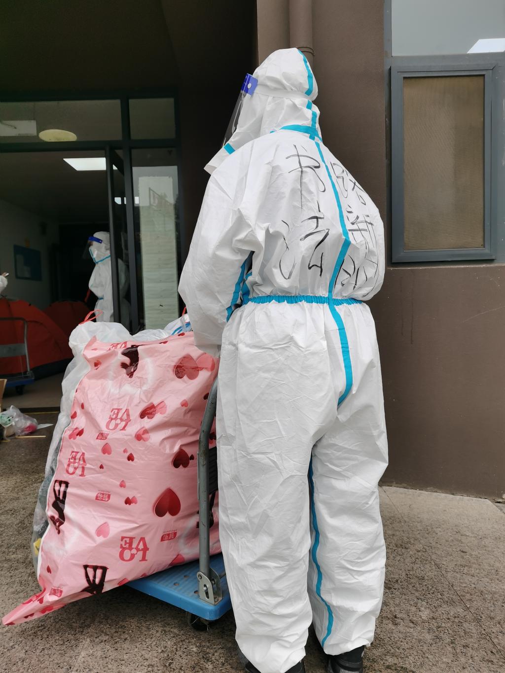 在封校抗疫期间,路老师每天都身穿防护服,用心守护着学生公寓。学生的一日三餐,都是路老师从一楼运到七楼,再逐一送至每个宿舍门口;帮学生们打水、清理垃圾、协调购买生活物资......直到深夜,路老师才能安歇下来,躺在楼道的帐篷里慢慢舒缓一天的疲惫。