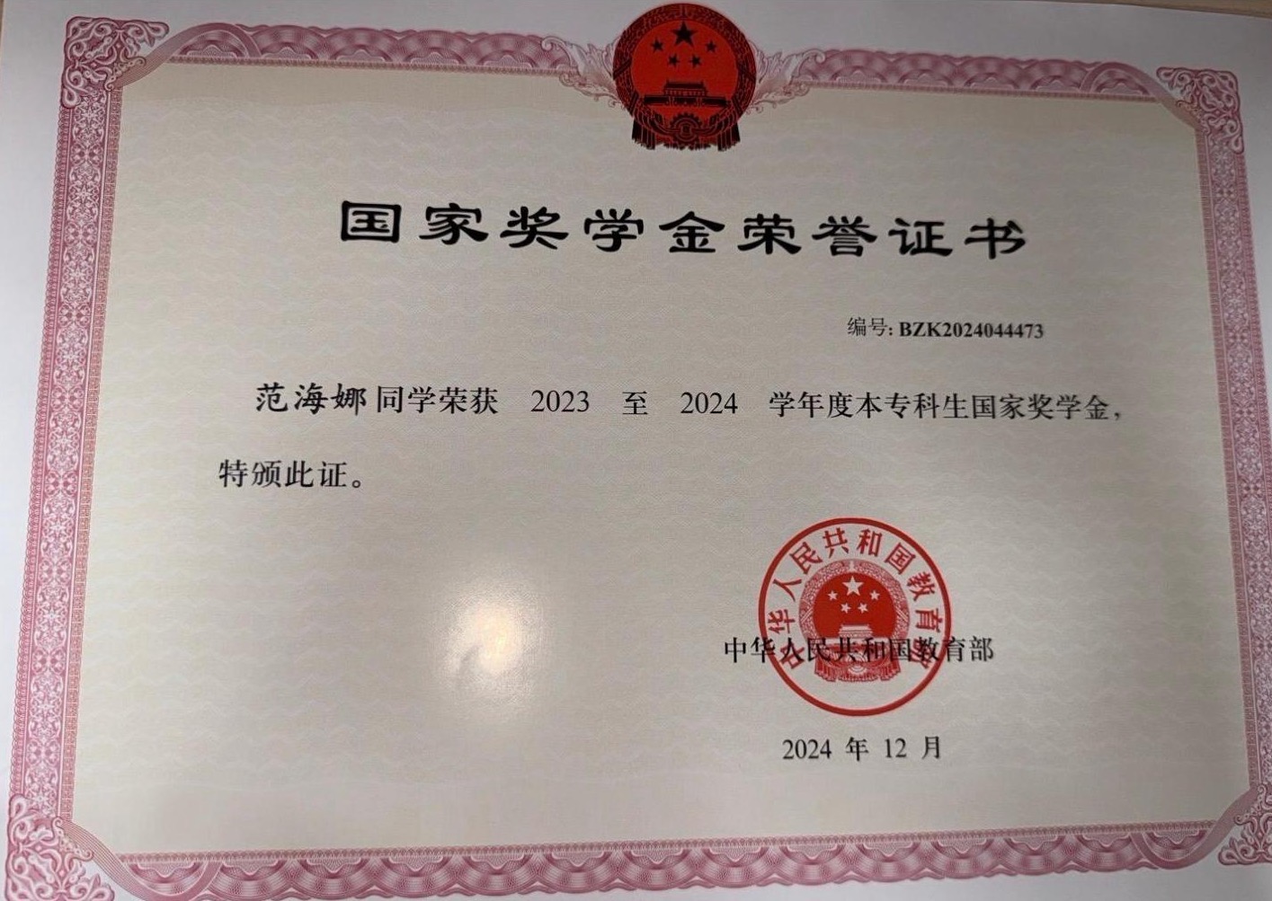 范海娜在学术上追求卓越,成绩优异。她荣获2023 - 2024学年国家奖学金,2024 - 2025学年校级三好学生,2023 - 2024学年第一学期大学语文课程“古诗词背诵默写打卡”坚持之星,2024 - 2025学年第一学期《马克思主义基本原理》优秀实践作品。她深知课堂学习的重要性,坚持每天出早功练习基本功,大量阅读影片,从中汲取播音创作的灵感。