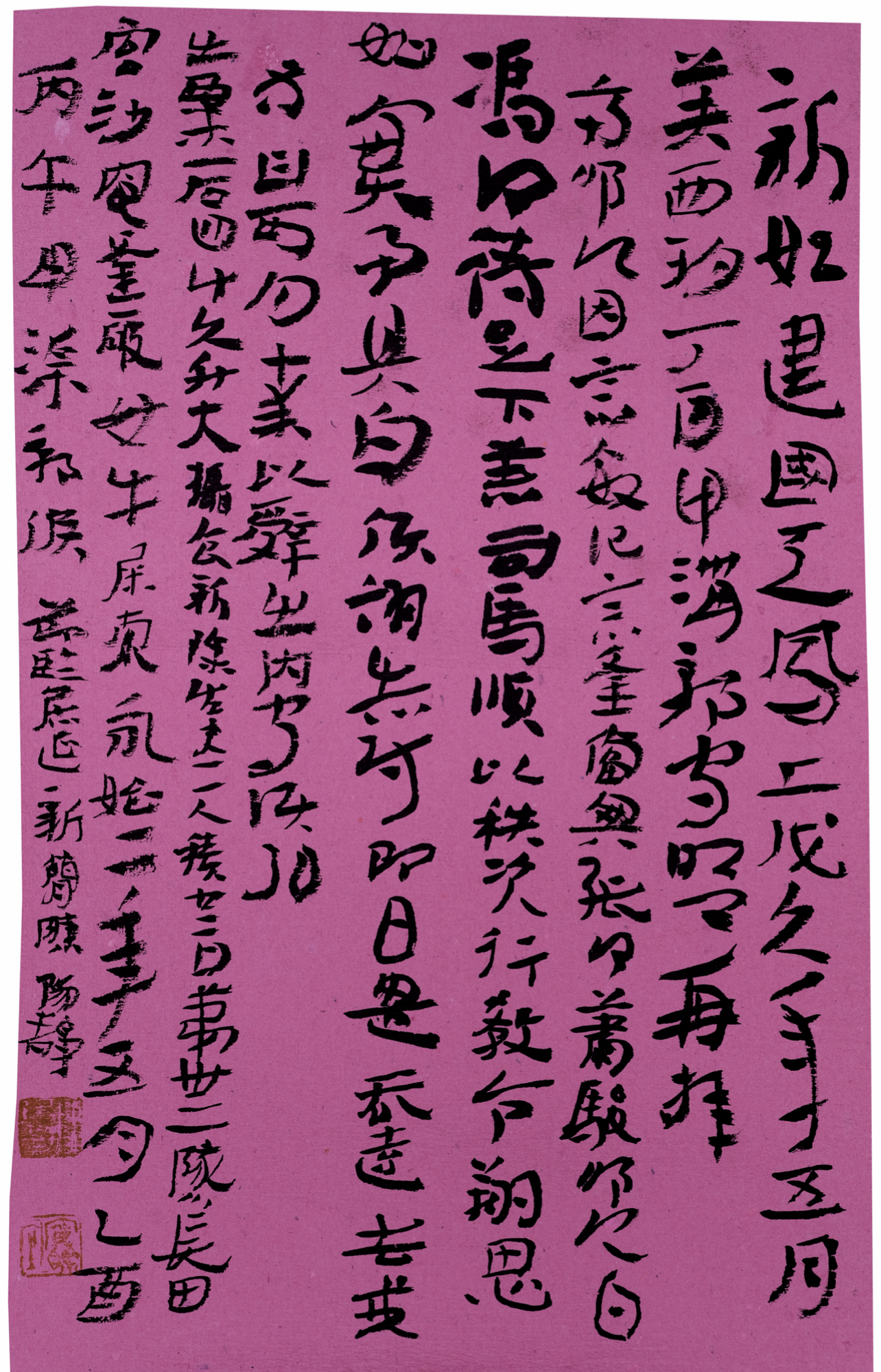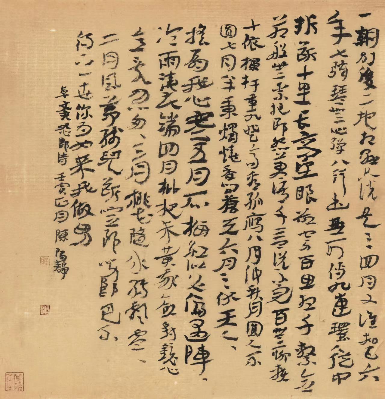 陈阳静是一个具有多向优异创作能力的书家。他以汉简草书为精擅,又于行书、大篆克尽其致。其行书宽博朴茂,自由烂漫;其写意大篆则浑肆饱满,充满感性力量,这与他对线的深刻理解和洞悉密不可分。“中国之所以讲究线的艺朮,正因为这线是生命的运动和运动的生命。”由陈阳静对汉简这一充溢着先民浪漫夭矫审美精神的古老书法文本的切己与自由把握,便明白见出他对线的心性化体认。在很大程度上,围绕草书线的精魄所展开的汉简草书创作,只是构成陈阳静草书创作的一个侧面。比之,他更在意于在经典与民间的双重向度中来把握体究草书的正与奇,这使他对二王帖学的理解有别于惯常。他试图在充分领略汉简无法之法与天趣浪漫的根基上,融汇魏晋二王草书的玄澹典正。“盖非知之难,能之难也。”(陆机《文赋》)此个体草书审美理想以其难能而具有了某种启迪风气的转换意义。由此,古意与浪漫,落实到笔法与风格上,便显示出某种有价值的开拓与启示;当代草书创作除“二王”之外仍有多元化的路径可走;而以书史真实的眼光,辩证认识与看待经典与民间书法,会生发出新的创造力。