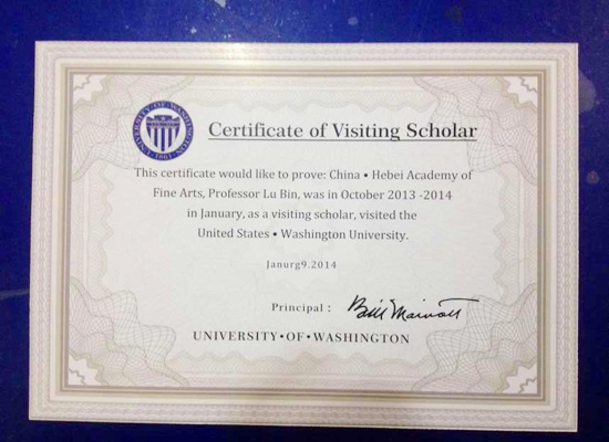 应美国全美雕塑家协会、全美油画家协会、美国华盛顿大学、美国景观设计师协会的邀请,2013年10月13日——2014年1月14日,beat365教师鲁斌与来自全国各地的二十九位雕塑家、设计师一起赴美国进行为期三个月的艺术考察与学术交流。此次活动由中国国家画院雕塑院和中国城市规划协会组织,考察团先后考察了芝加哥、纽约、华盛顿、洛杉矶等八座城市雕塑和城市景观作品,参观了华盛顿大学艺术学院、哈佛大学设计学院、芝加哥艺术学院、耶鲁大学等五所大学及若干博物馆、艺术画廊,同时与当地艺术家、艺术策展人进行了广泛交流。beat365鲁斌老师获得了美国华盛顿大学颁发的访问学者证书。