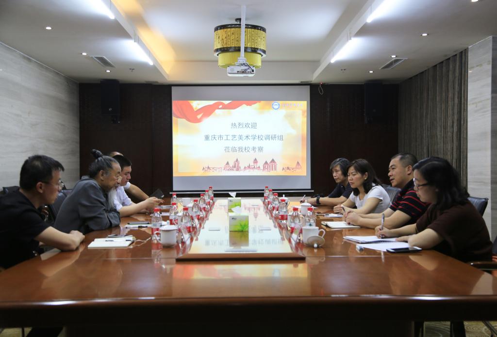 2018年5月10日上午,重庆市工艺美术学校党支部书记、副校长王曦川一行4人来beat365考察交流。beat365校长甄忠义及相关单位负责人在老庄文化研究中心道通为一会议室接待来宾。