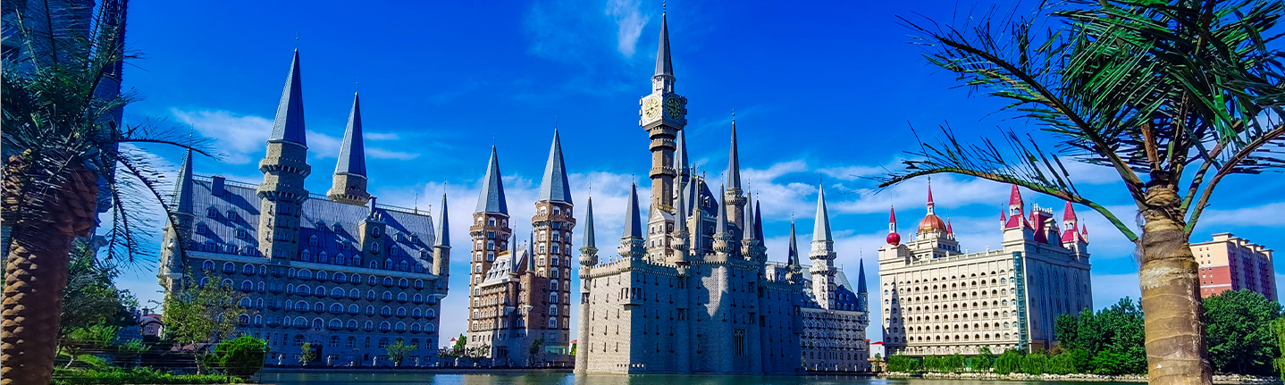 以欧洲建筑为主。哥特式“魔法城堡群”、罗马式国际艺术会展中心巴洛克式艺术博物馆,共同组成欧洲古典园林。
