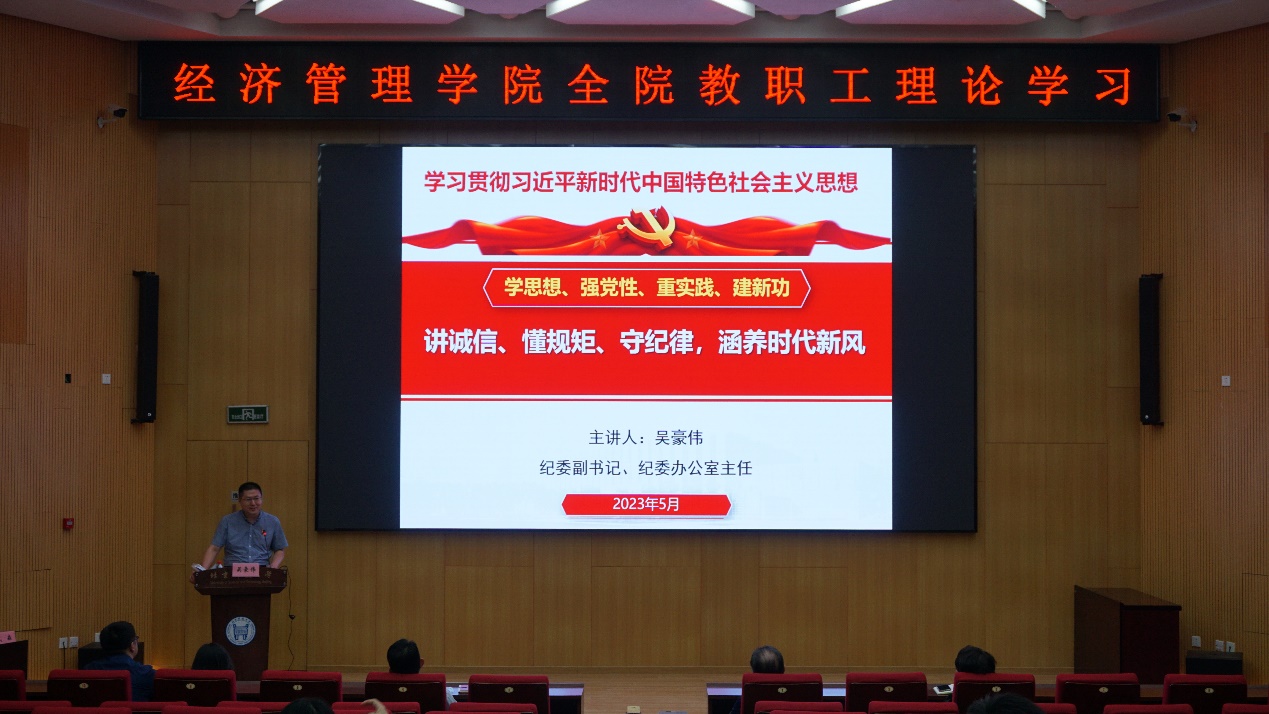 为深入开展学习贯彻习近平新时代中国特色社会主义思想主题教育,扎实推进学院主题教育工作,深刻领悟习近平总书记关于教育的重要论述,深刻理解习近平总书记给我校师生的两封重要回信精神,进一步加强全体教职工思想政治和师德师风工作,根据学校2023年党风廉政宣传教育月活动安排,2023年5月25日下午,永利集团88304官网在线登录组织全院教职工理论学习,开展专题教育培训,邀请学校纪委副书记、纪委办公室主任、学校主题教育专项联络组三组组长吴豪伟以《讲诚信、懂规矩、守纪律,涵养时代新风》为主题进行专项培训。学院全体教职工参加学习,会议由学院党委书记武森主持。