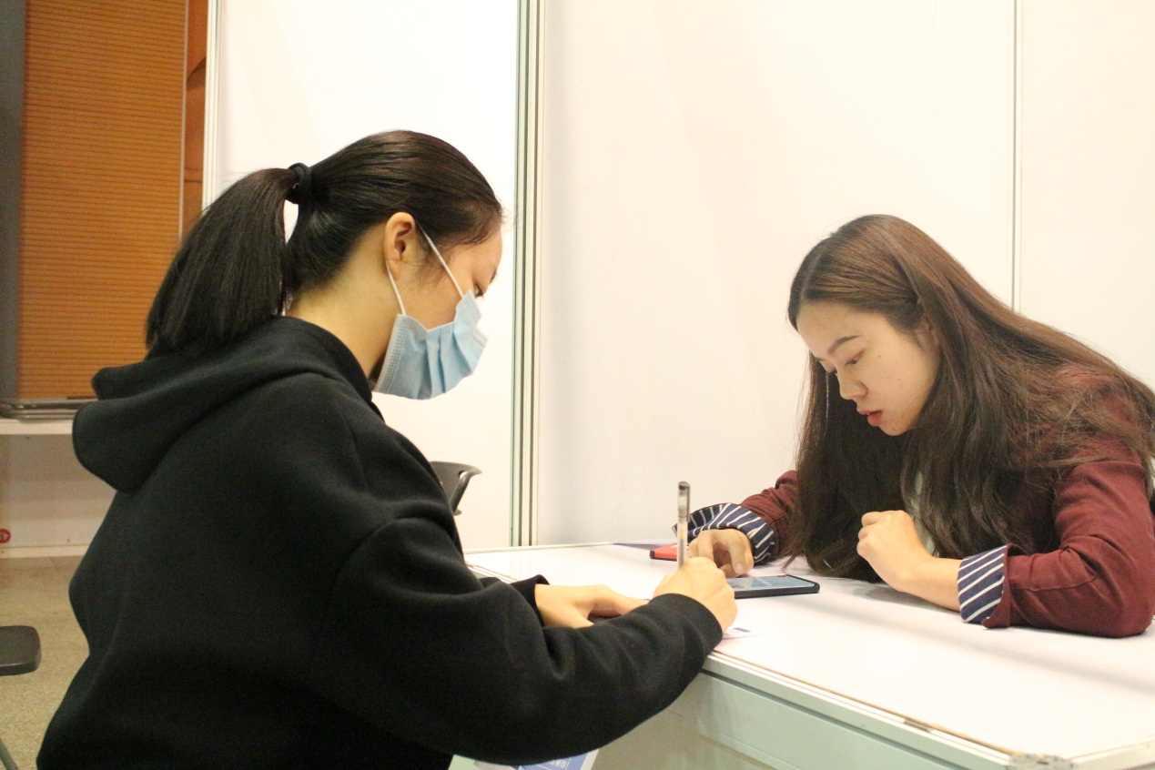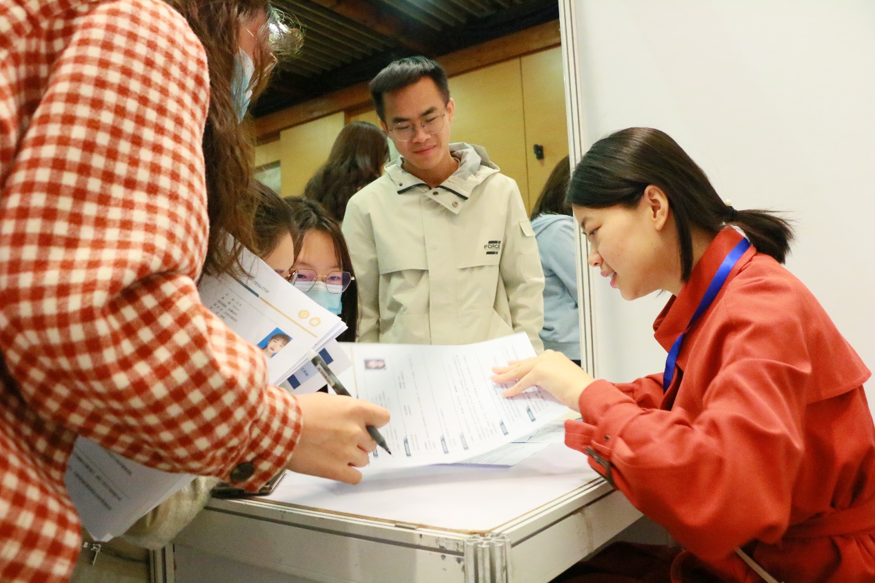 活动现场,各企业充分展现企业风貌,同学们也积极地向企业了解岗位要求,在一些企业咨询台前更是排起了“长龙”。此外,本次双选会特别设置了“简历问诊台”区域,由学院辅导员帮助同学们修改简历,答疑解惑,开展相关指导。