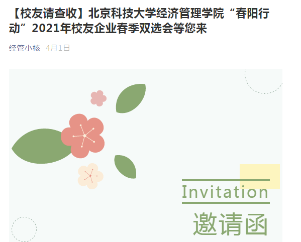 活动前期,学院面向校友广泛发布邀请函,邀请各位校友继续发挥影响力,为学弟学妹们提供就业信息,提供实习机会,开拓就业渠道,积极动员所在单位参与学院“春季双选会”。